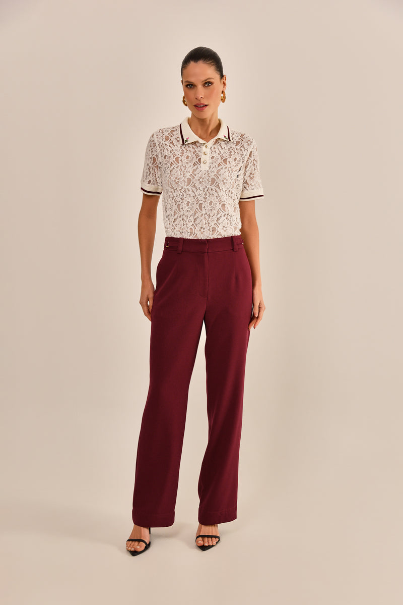A blusa polo Alix é confeccionada em renda na cor off white. Possui modelagem polo, slim, gola aplicada com vista de botões e mangas curtas. A novidade desse clássico fica por conta da renda com transparência e detalhes aplicados em bordados manuais na gola.