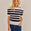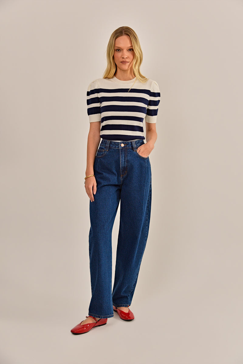 A blusa Colombiana é feita em tricot de viscose off white, com listrado na cor azul marinho. Possui modelagem slim, mangas curtas, decote redondo e acabamento simples. Peça básica e essencial para criar um visual marcante e feminino.