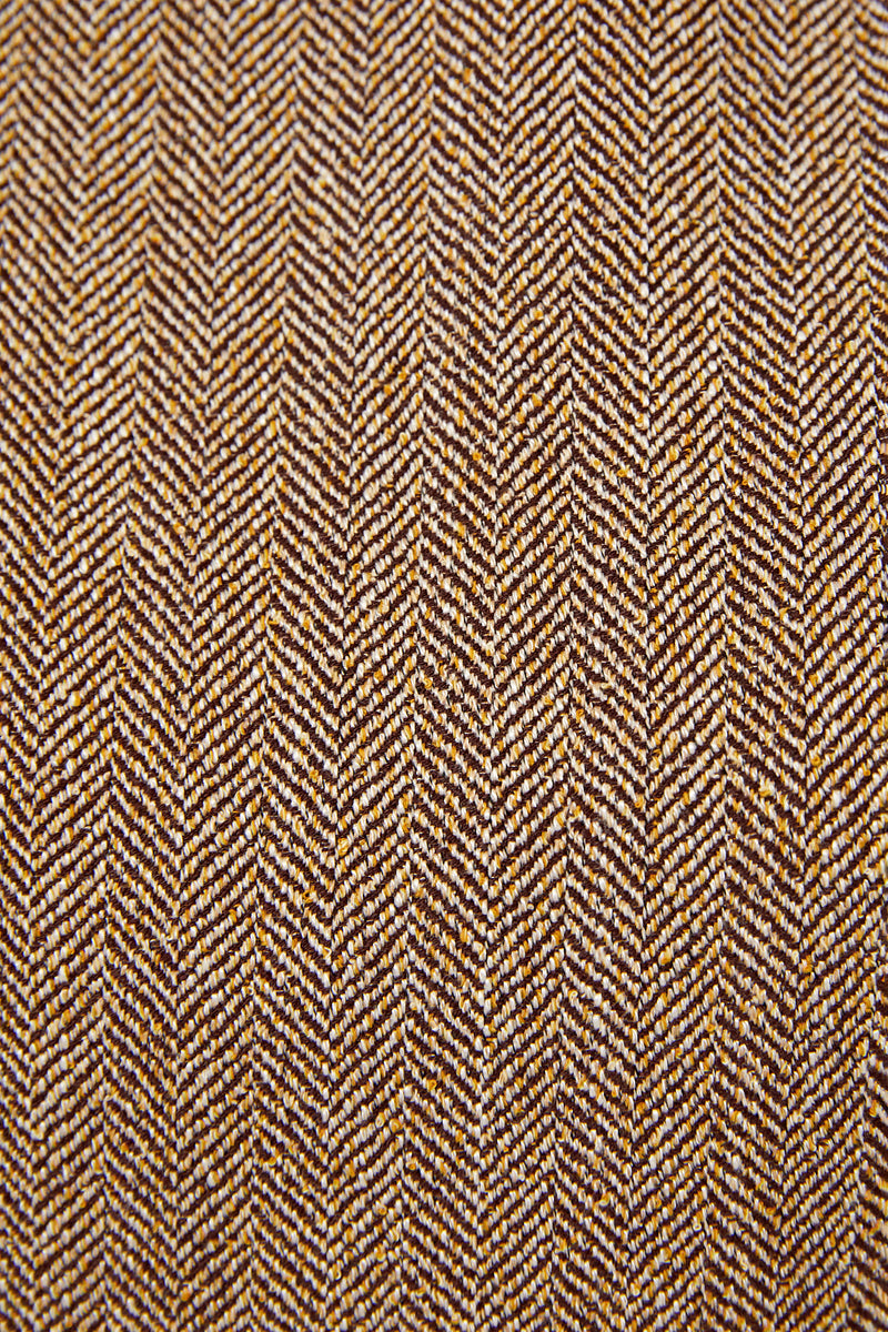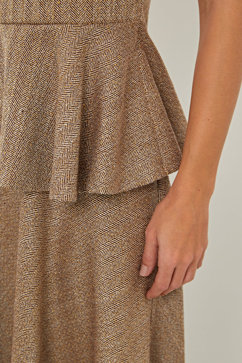 Blusa Giovana confeccionada em alfaiataria chevron tweed. Modelagem slim, decote redondo, alças médias, cintura marcada, drapeado elegante na altura da cintura e barra simples. Coleção: Amour.