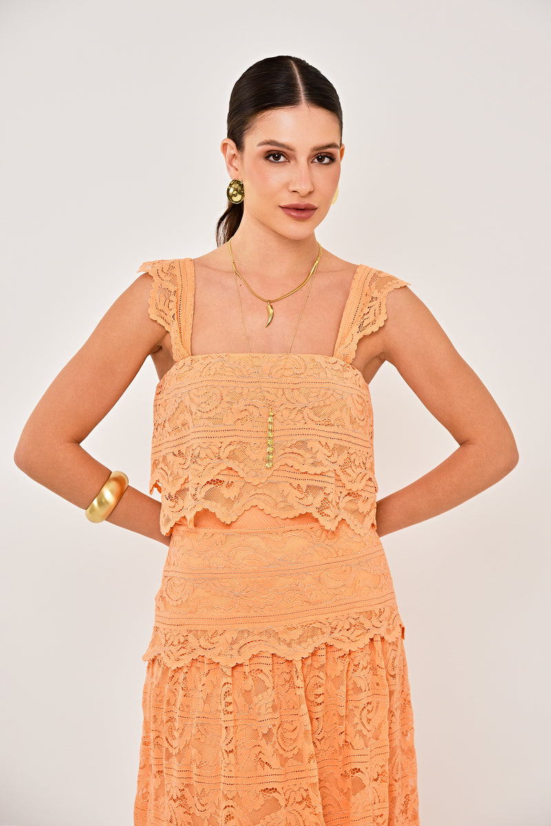 Blusa Ludique confeccionada em crepe de viscose com aplicação de rendas na cor tangerina. Modelagem slim, decote quadrado, alças finas acabamento simples. Coleção: Saint-Tropez.