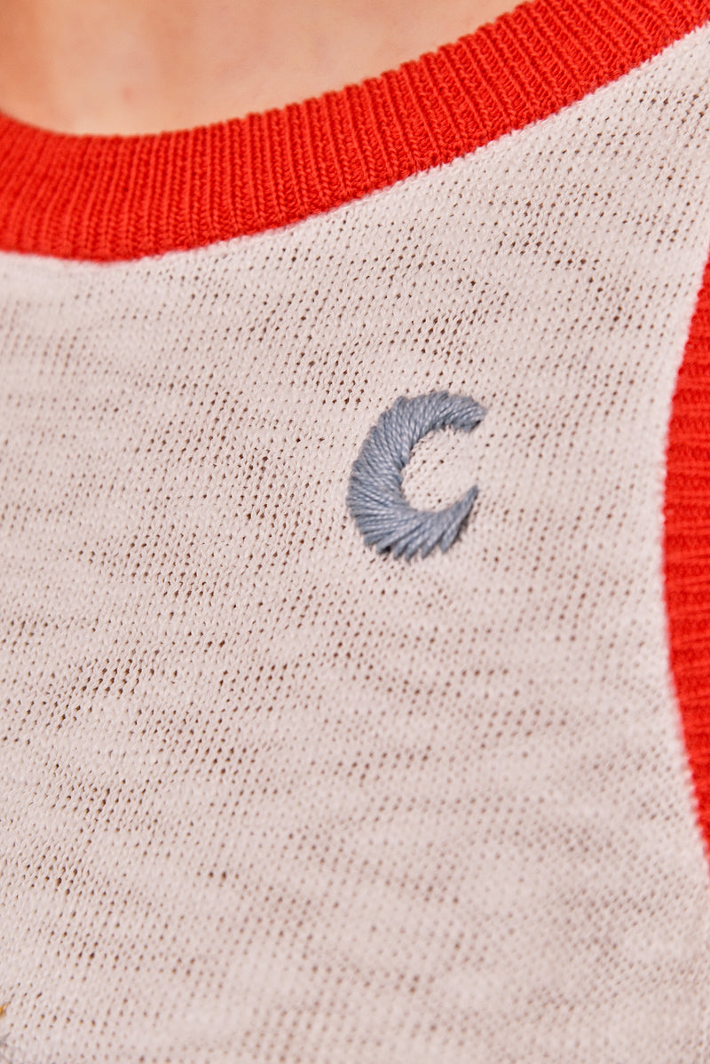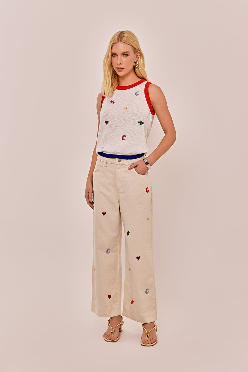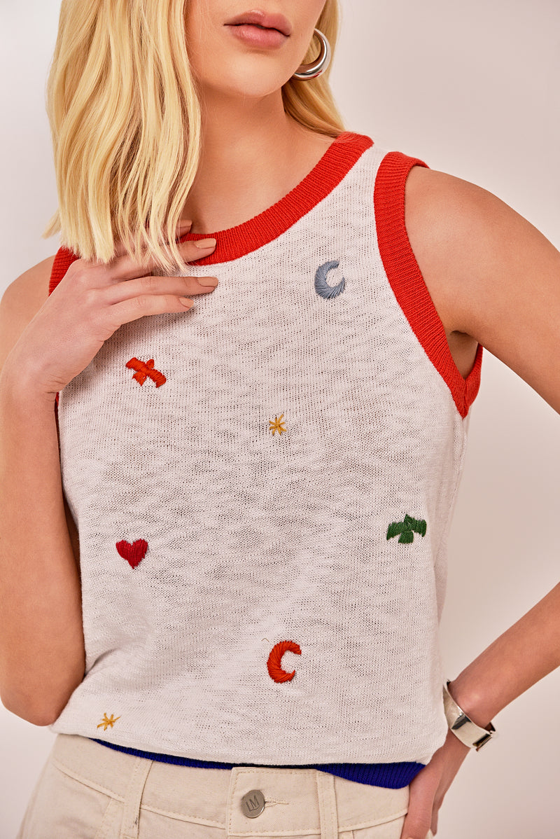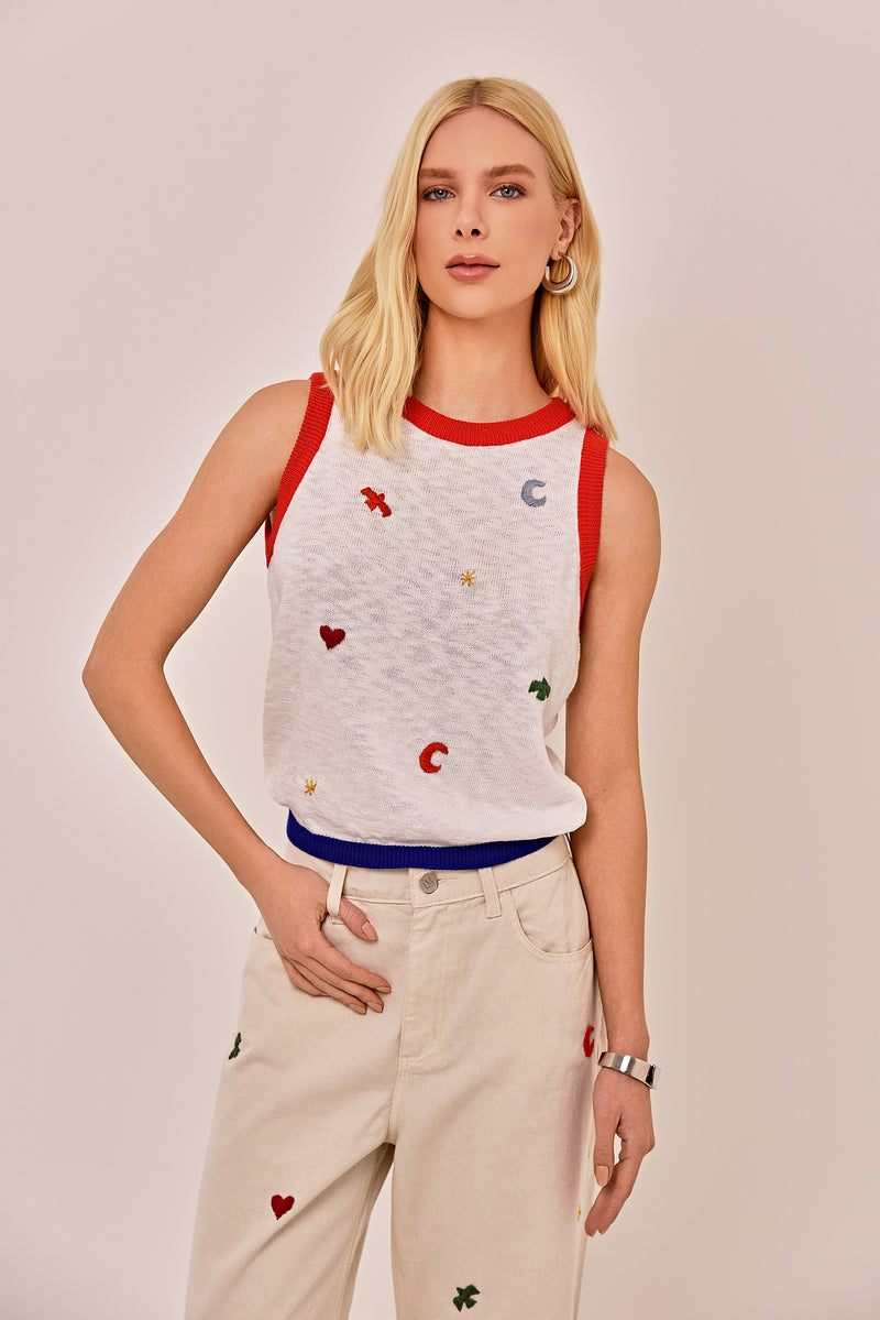 A blusa regata Nuit é feita em tricot, disponível na cor off white. Possui modelagem slim, regata, decote redondo e acabamento em cor de contraste, vermelho e azul. Os detalhes ficam por conta dos bordados manuais em elementos coloridos.