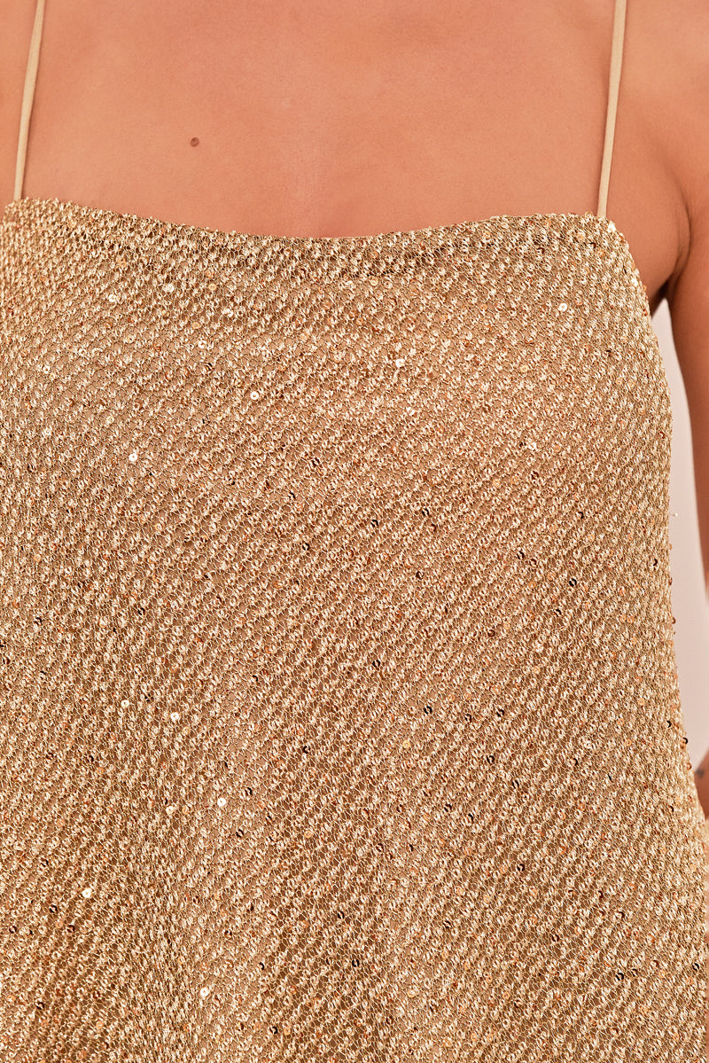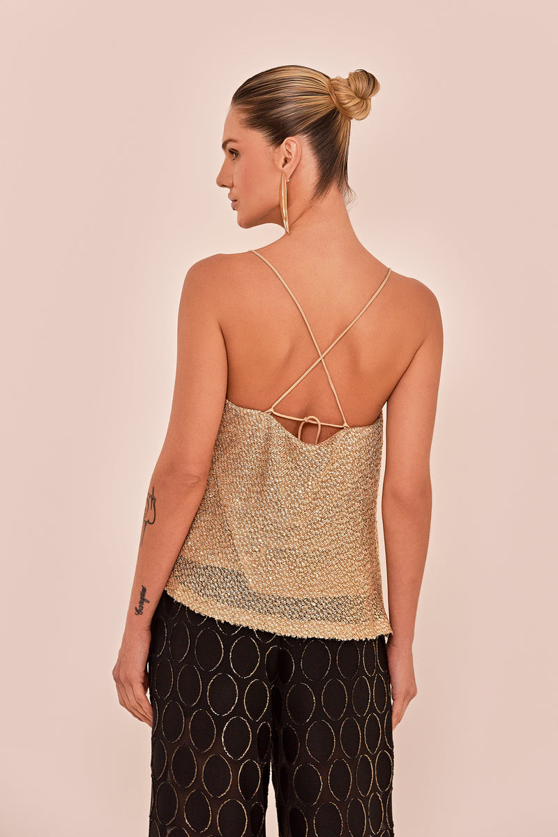 A blusa Primavera é feita em malha lurex, disponível na cor dourada. Possui modelagem ampla, decote redondo, alças finas e cruzadas nas costas, brilho sofisticado, forro aplicado e acabamento simples.