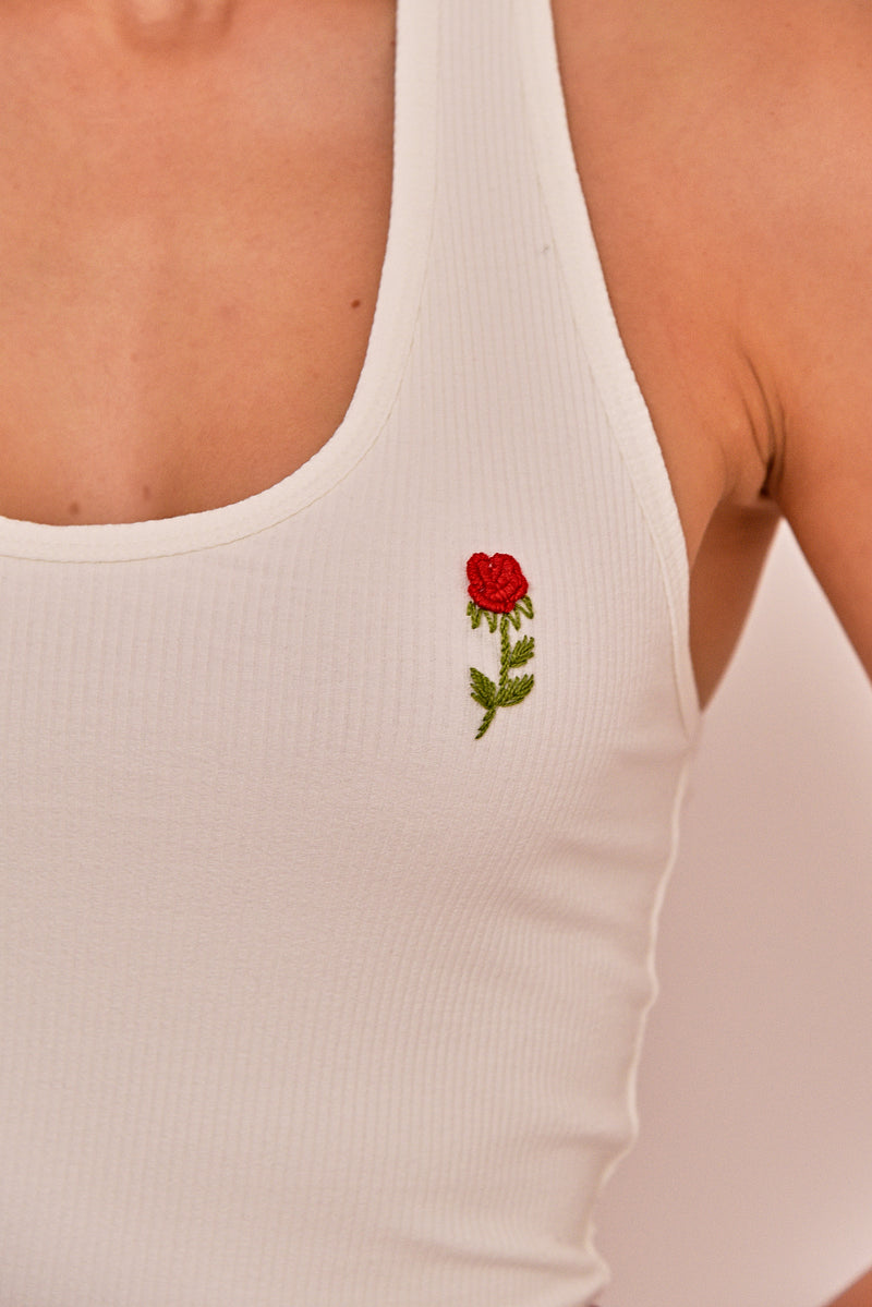 A blusa Porto é feita em ribana de viscose, disponível nas cores preto e off white. Possui modelagem slim, regata frente única com decote redondo e acabamento simples. Mini rosa aplicada em bordado manual na parte frontal. Uma peça básica, prática e essencial para o seu closet.