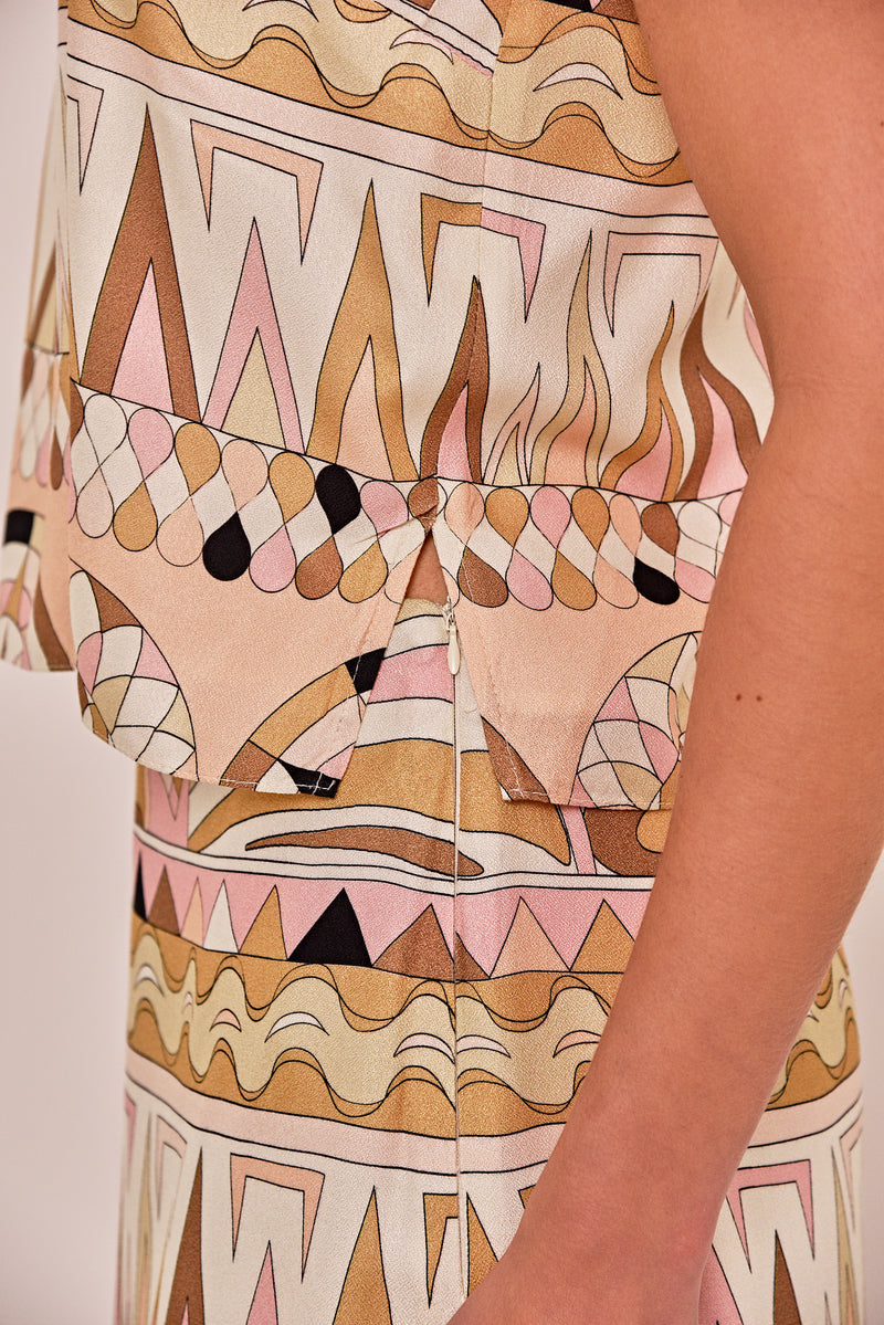 A blusa Tiger é feita em crepe de viscose estampado com motivos orgânicos em cores pastel, de inspiração Pucci. Possui modelagem slim, decote reto, alças finas e acabamento simples. Detalhe nas costas com decote e aberturas laterais na barra.