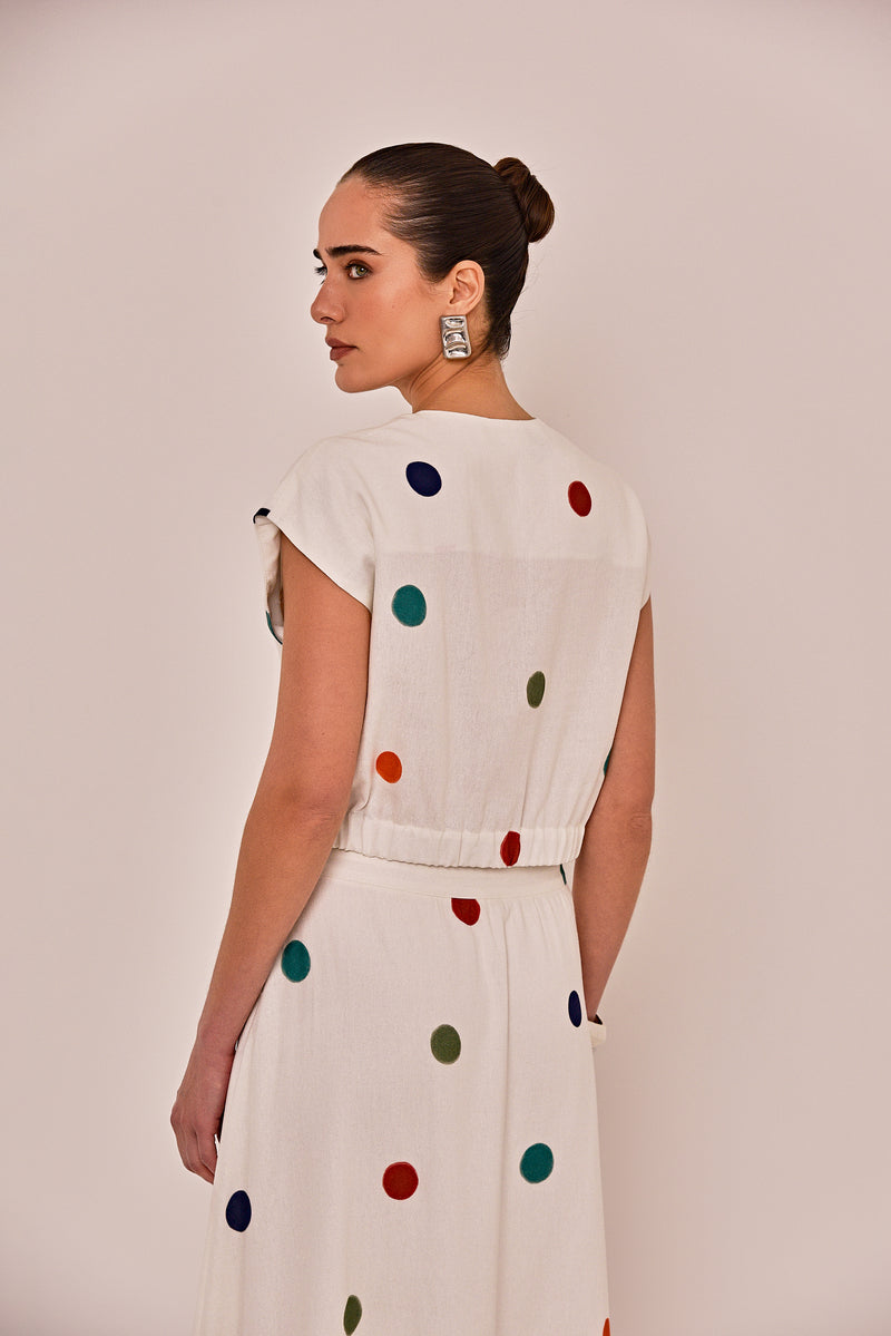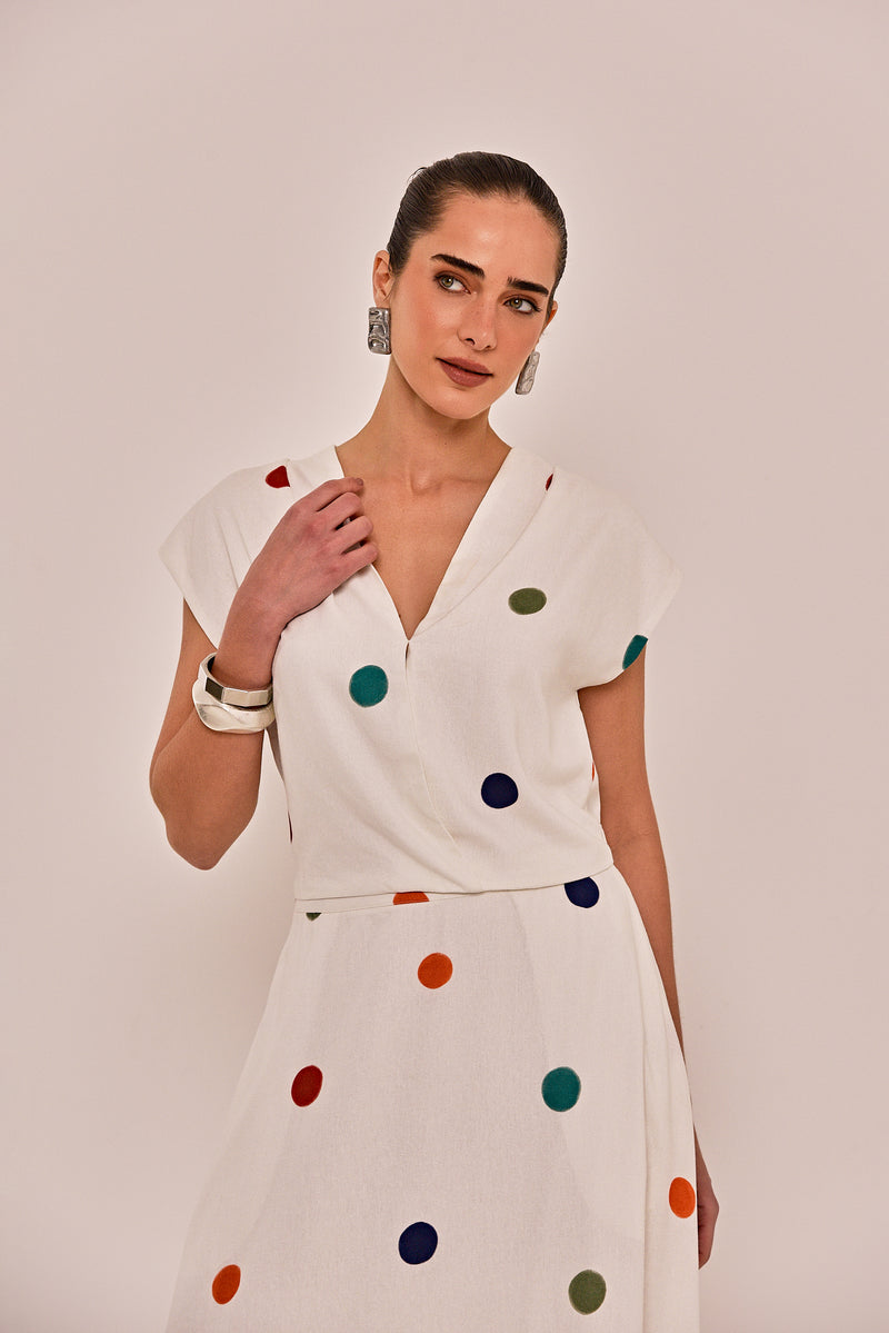 A blusa Trevo é feita de viscolinho estampado em poá multicolorido. Possui modelagem reta, decote v, mangas curtas e barra aplicada em elástico. Sujeita a alterações no tom do tecido. As produções combinadas entram em jogo quando o assunto é um visual elegante, moderno e prático.