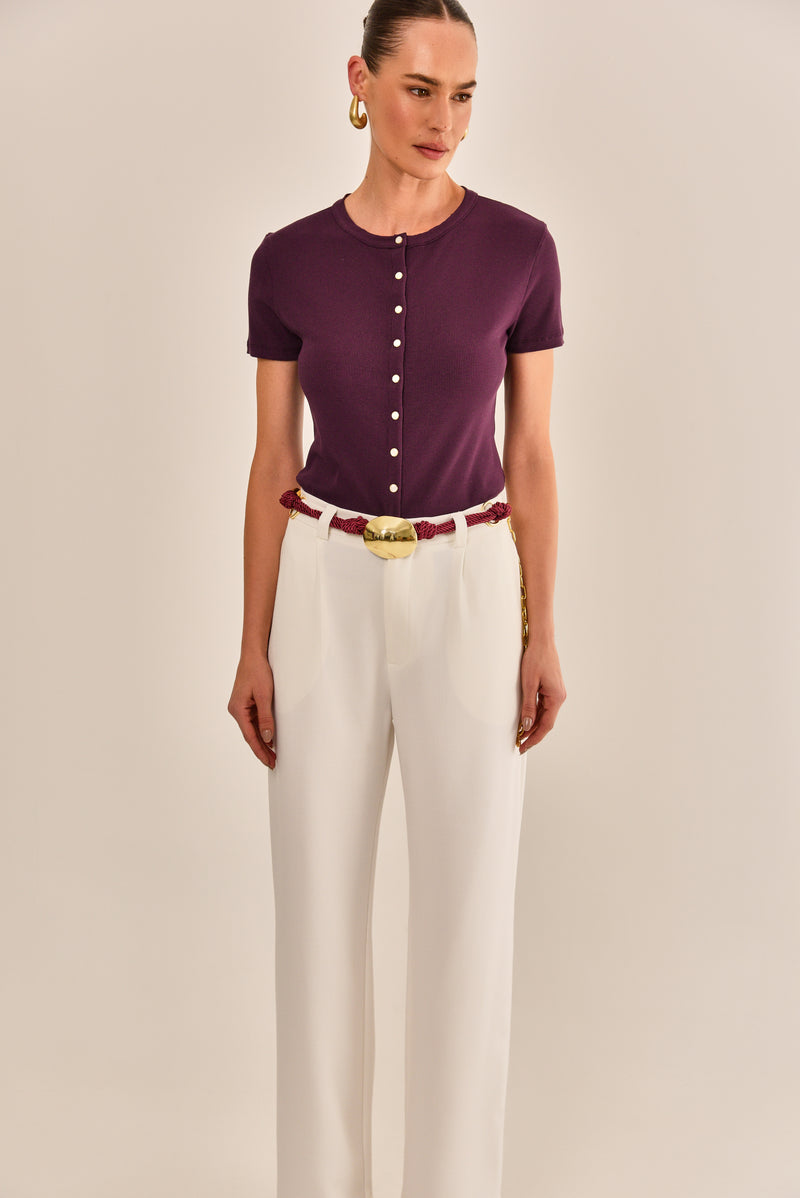 A blusa Twist é feita em malha ribana, disponível nas cores: preto e roxo. Possui modelagem slim, gola redonda, fechamento frontal por botões de pressão metálicos, manga curta e acabamento simples. Esta peça é um clássico, valoriza a silhueta com simplicidade e elegância.