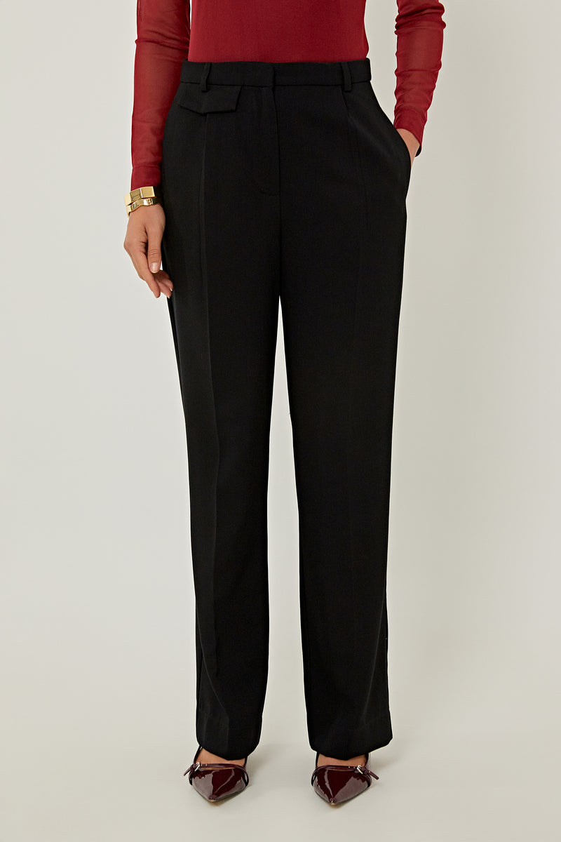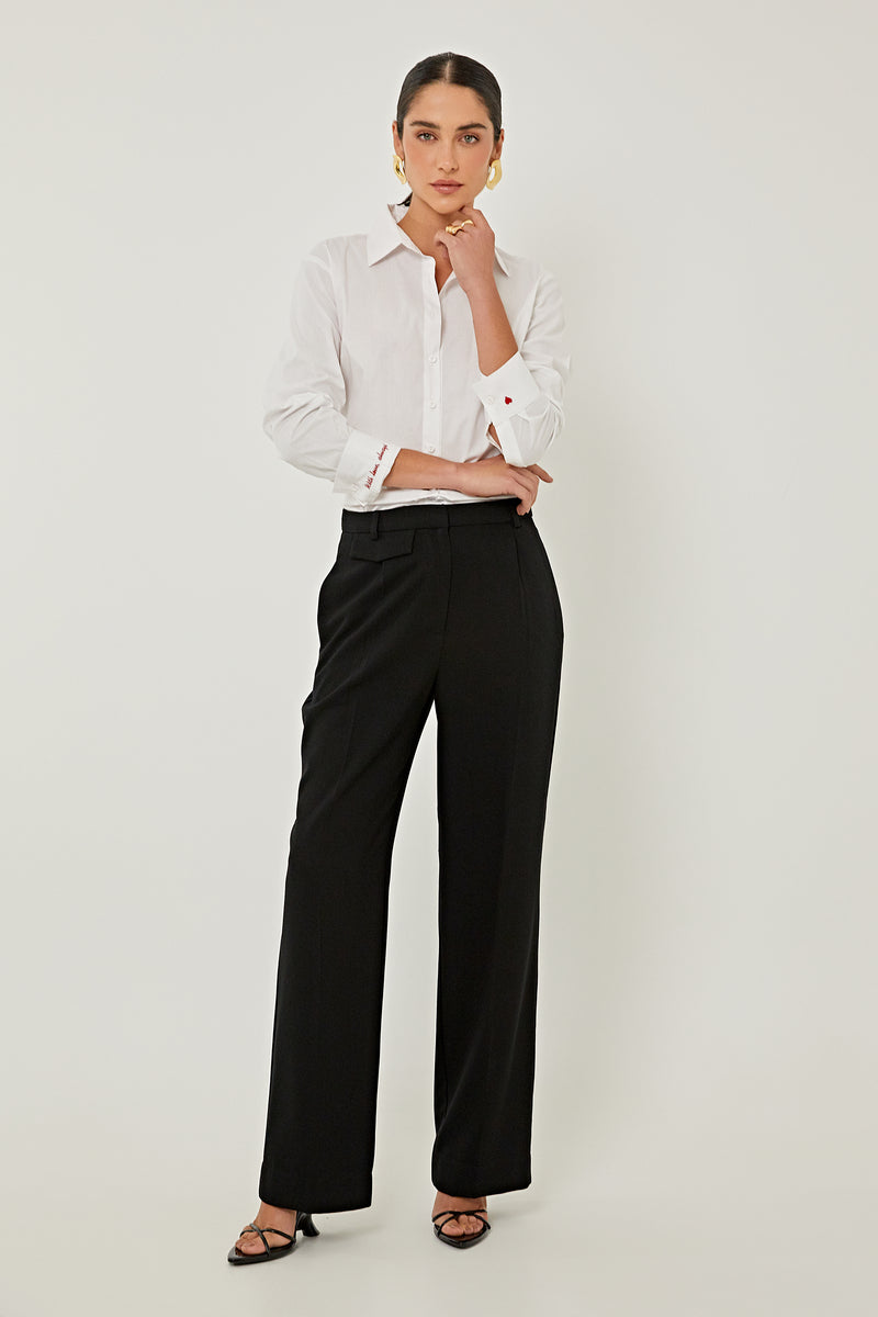 Calça Flórida confeccionada em alfaiataria galena na cor preta. Modelagem reta, cós aplicado com fechamento por zíper, bolsos laterais, posteriores e barra simples. Coleção: Ser Linda.
