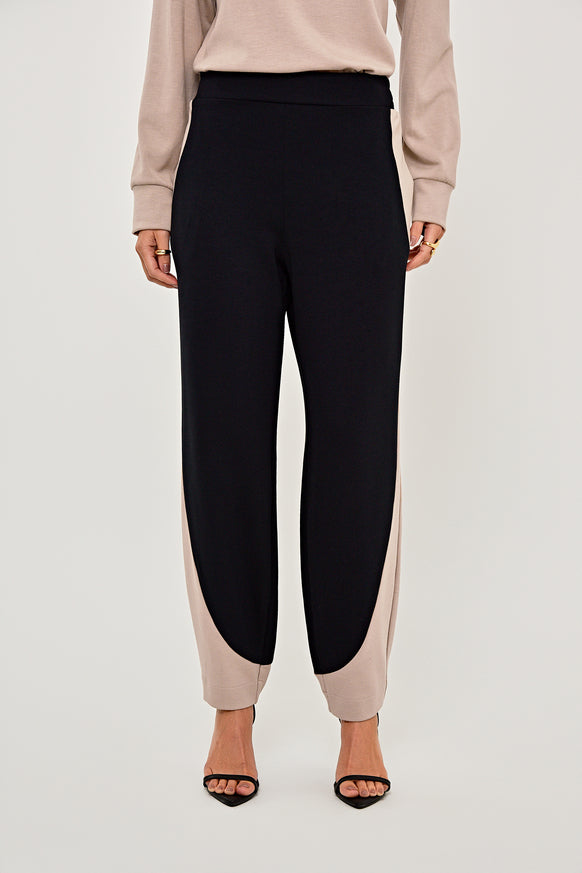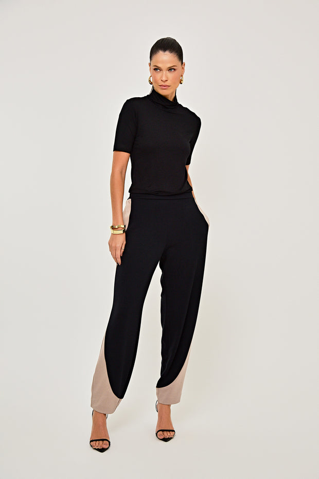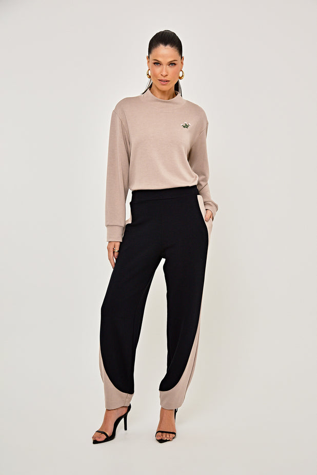 Calça Lili confeccionada em malha saint tropez nas cores preto e bege. Modelagem alicut, cós aplicado com elástico, bolsos laterais e barra aplicada com detalhe ajustado. Coleção: Respira.