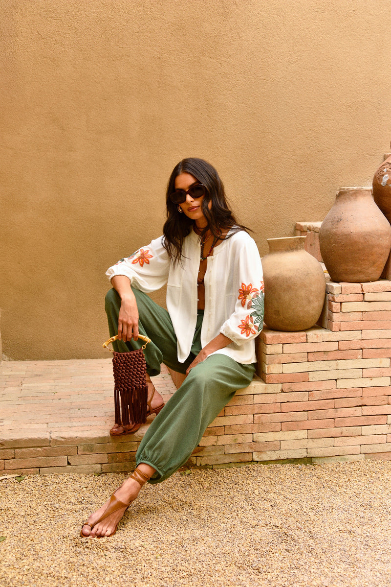 Use a calça Pupila com a blusa Purity em mesmo tecido e cor, formando um look leve e prático. Parte da coleção Marrakech, onde tradição e modernidade se encontram em uma estética sofisticada e atemporal.