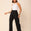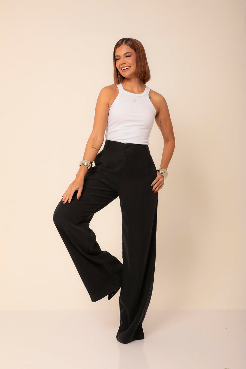 A calça Luiza produzida em crepe de viscose com cintura alta, modelagem reta, pregas e bolsos faca frontais. Possui fechamento por ziper, gancho de metal e botão de segurança.