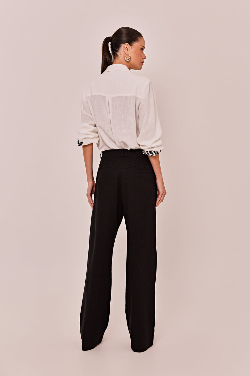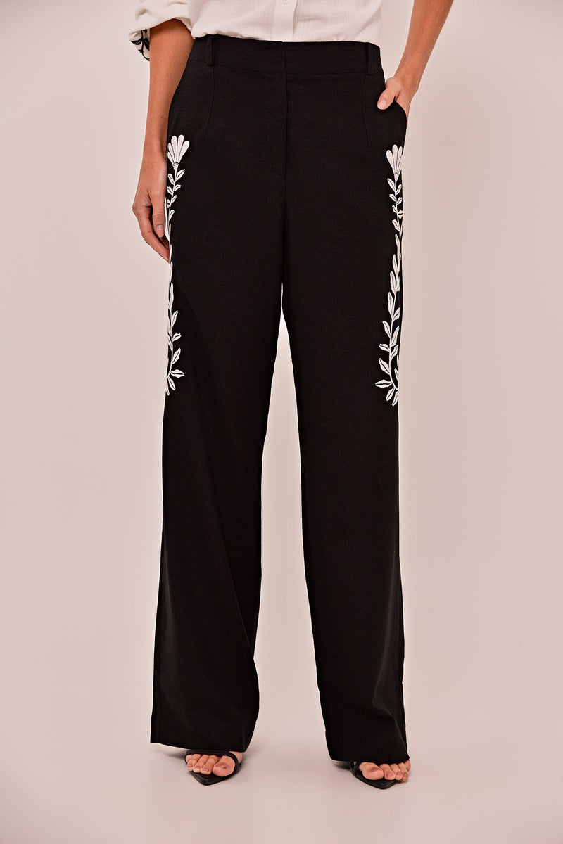 A calça Sara é feita em viscolinho com bordado, disponível na cor preto. Possui modelagem reta, cós aplicado, bolsos laterais e posteriores e barra simples. Detalhe por conta da aplicação de bordado floral em cor de contraste na lateral da peça.