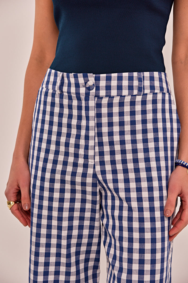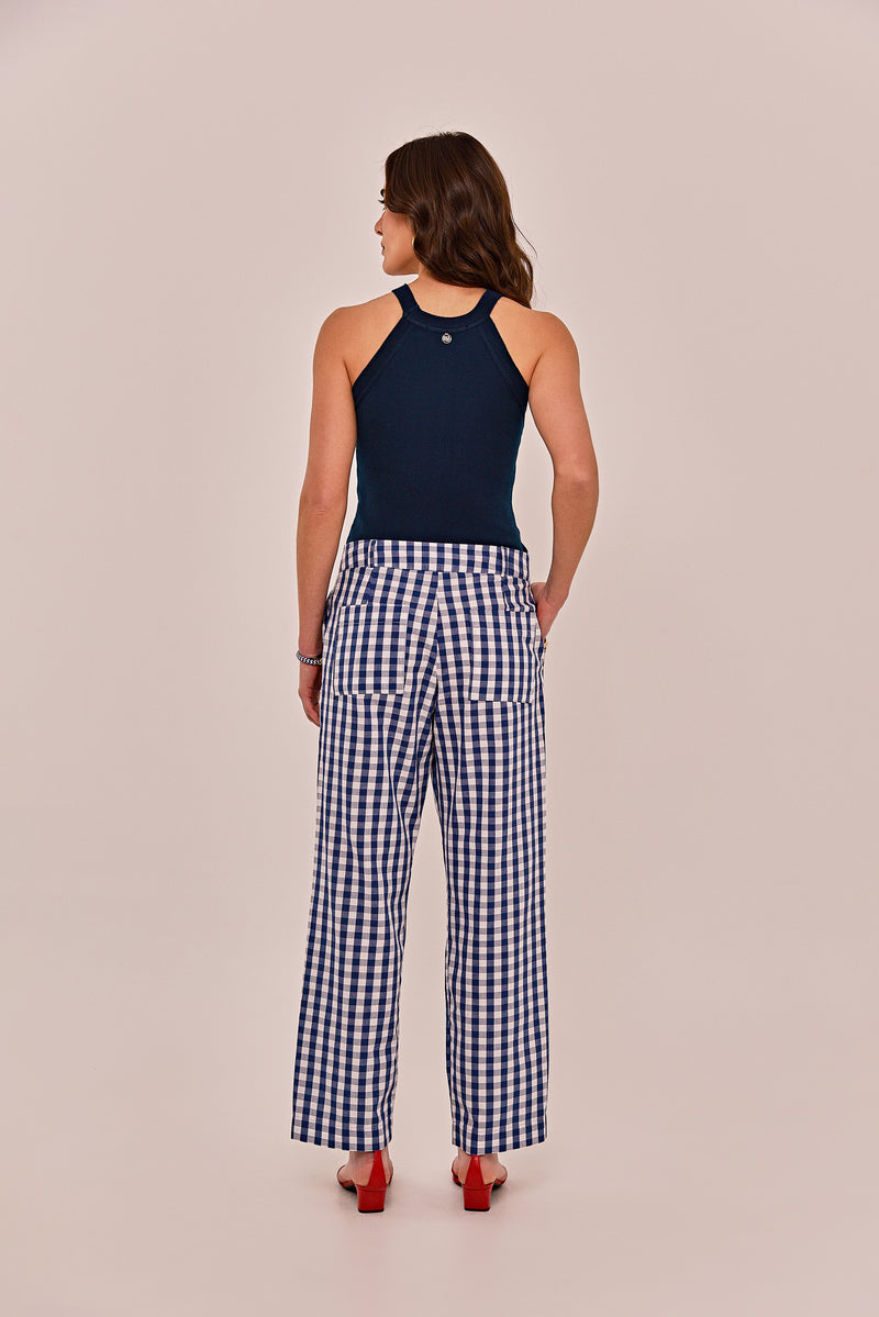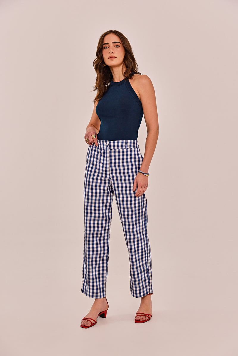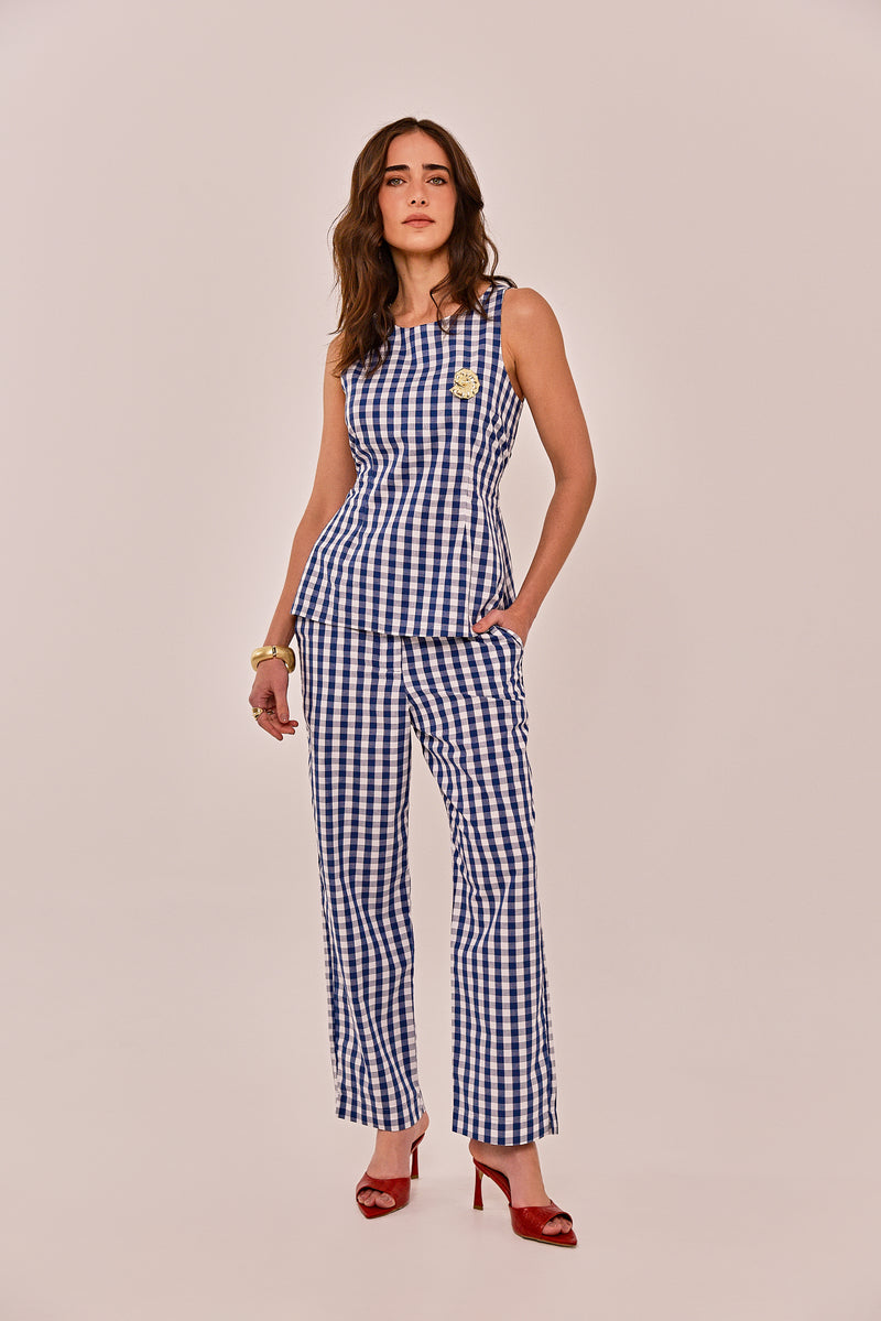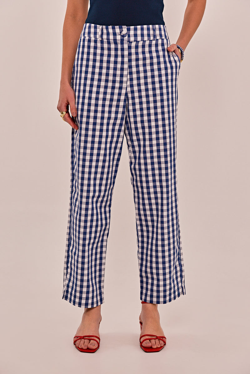 A calça Tarsila é feita em cotton com estampa vichy, estampa disponível nas cores azul marinho e off white. Possui modelagem carrot, cós aplicado em cintura média, bolsos laterais e posteriores. Calça leve com estampa atemporal, indispensável em seu closet.