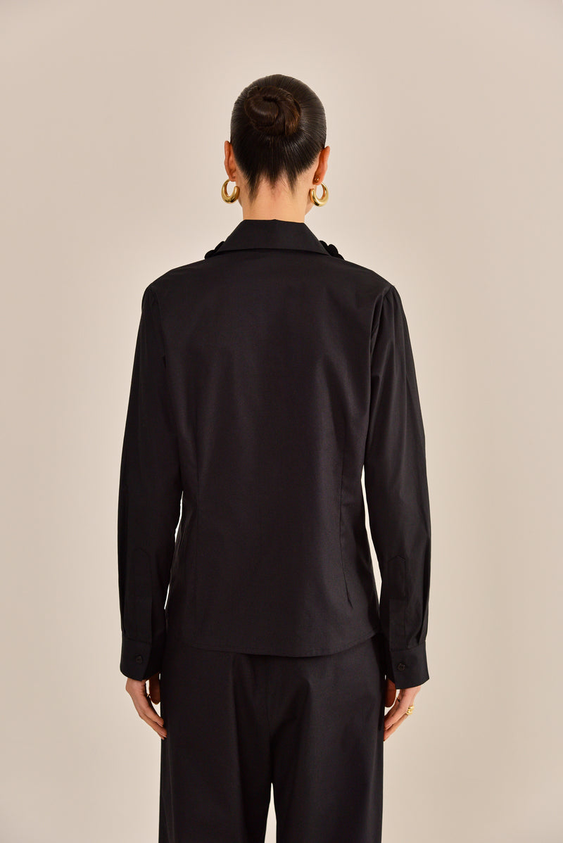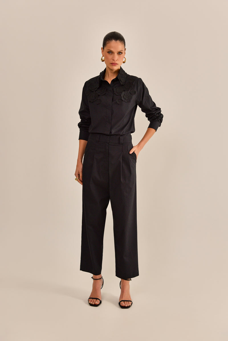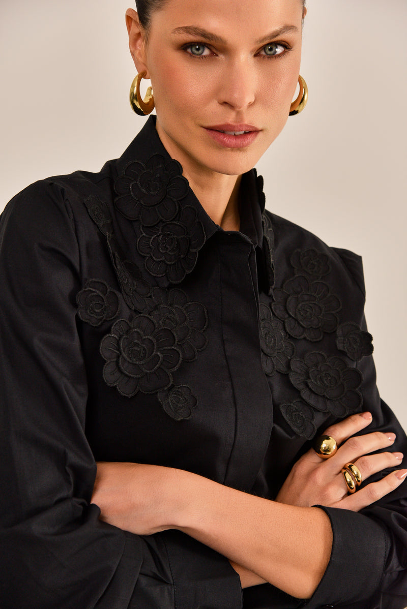 A camisa Amalfi é feita em tricoline, disponível na cor preto. Possui modelagem reta, mangas longas, vista de botões, bordado aplicado e acabamento simples. Detalhes de flores bordadas aplicadas por toda a frente da peça.