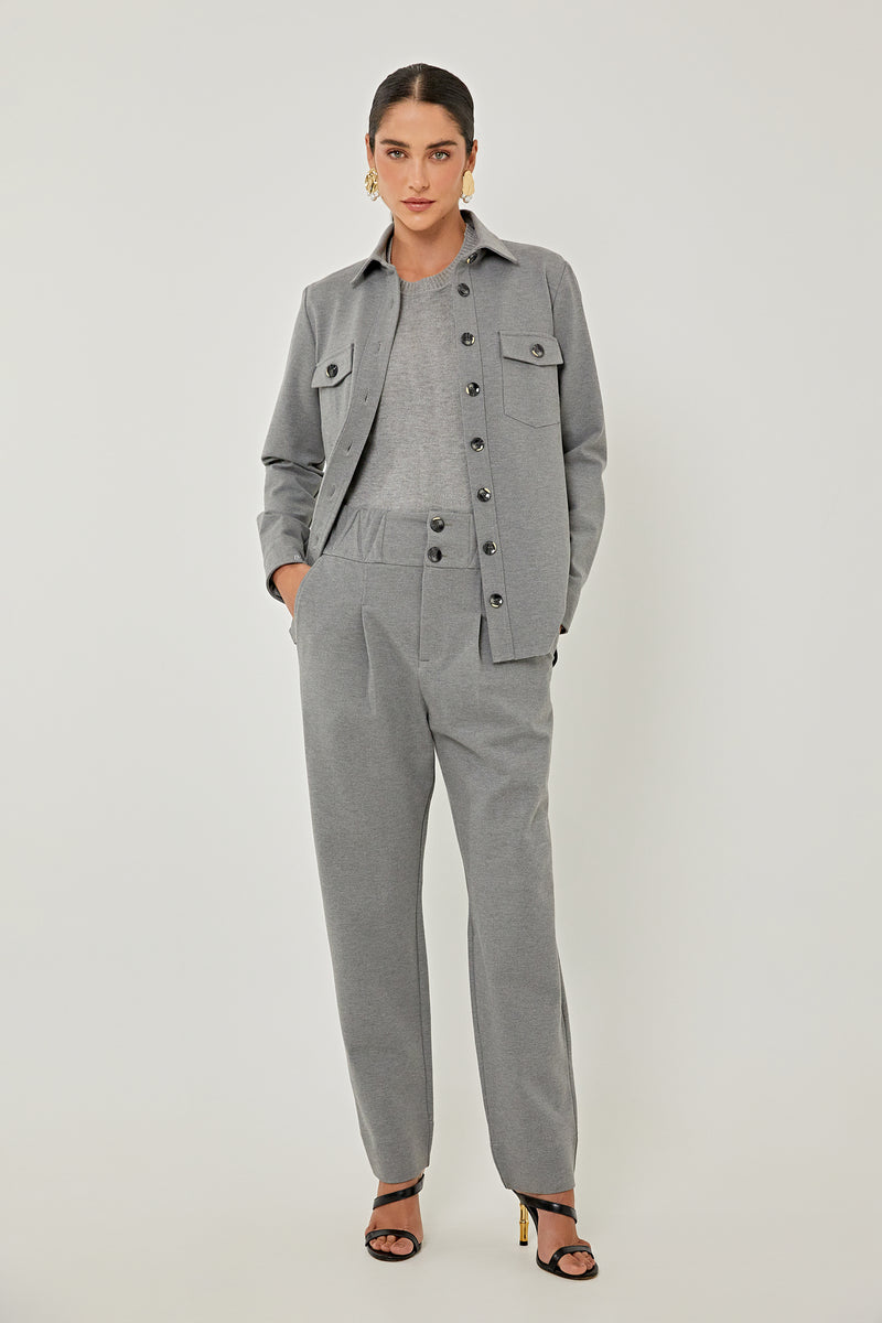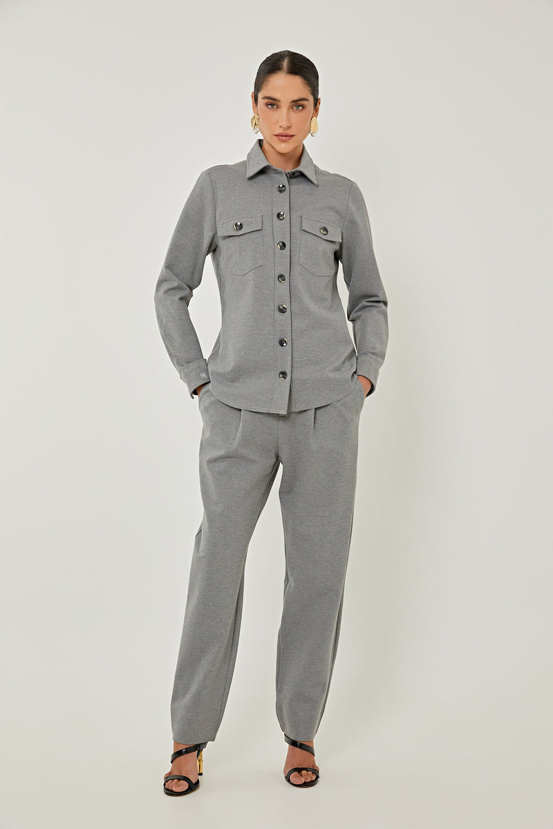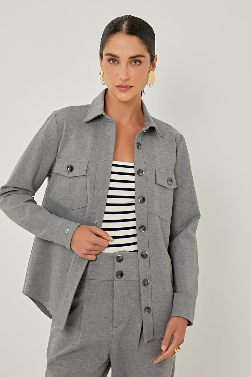 Camisa Imensidão confeccionada em malha de viscose dupla na cor cinza mescla. Modelagem reta, vista de botões, dois bolsos frontais, comprimento levemente alongado e acabamento simples. Peça estruturada e com caimento perfeito. Coleção: Ser Linda.
