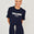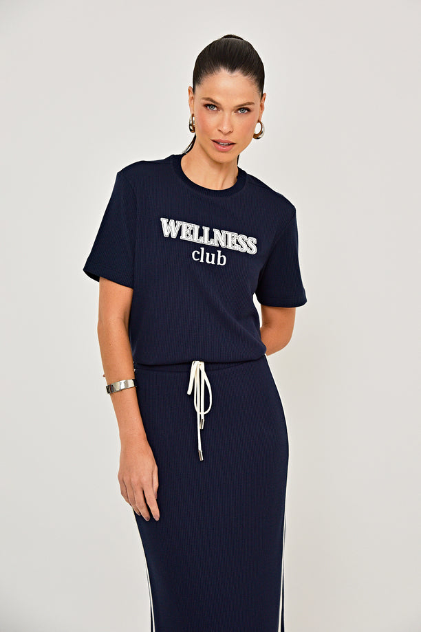 Camiseta Letícia confeccionada em malha bubble azul marinho. Possui decote redondo, mangas curtas, modelagem slim e acabamento simples. Estampa frontal com estilo sportswear. Coleção: Respira.