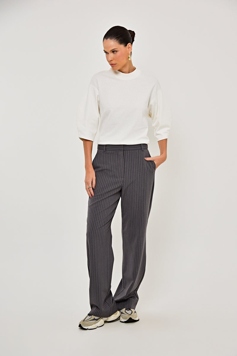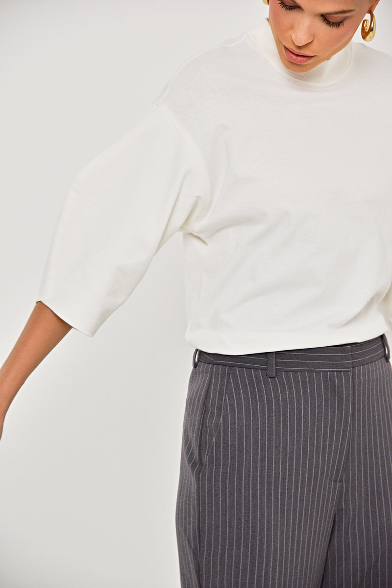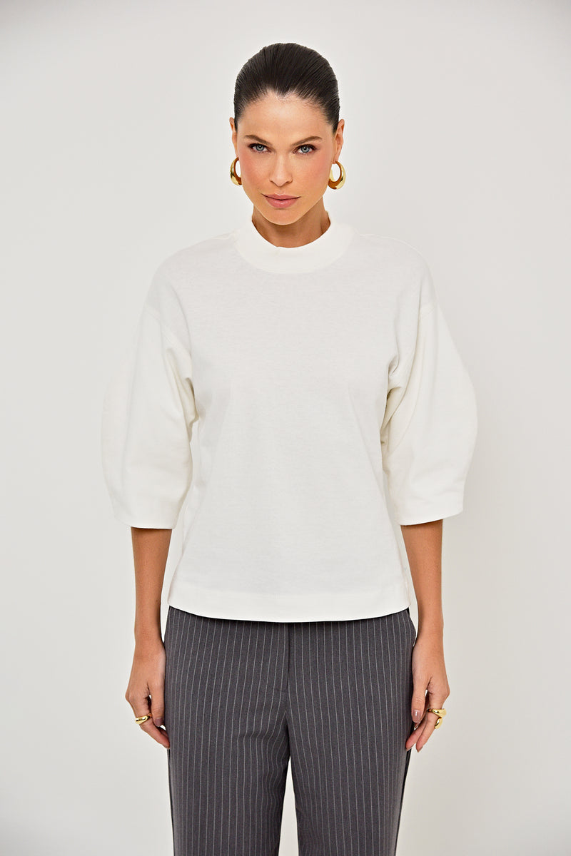 Camiseta Li1lly confeccionada em malha penteada off white. Possui modelagem reta, gota levemente alta, mangas 3/4 com leve bufante, barra e acabamento simples. Versátil e confy, perfeita para compor produções urbanas, peça-chave para quem busca elegância e conforto. Coleção: Respira.