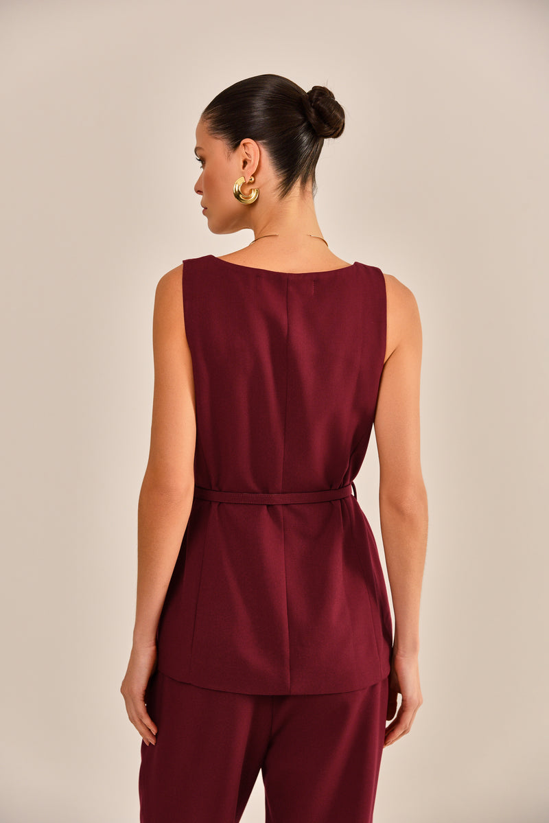 O colete Yasmin é feito em alfaiataria galena, disponível na cor vinho. Com modelagem acinturada, decote redondo, regata com cavas estruturadas, fechamento por botões frontais e acabamento simples. Acompanha cinto do mesmo tecido com ilhoses metálicos e fivela ajustável.