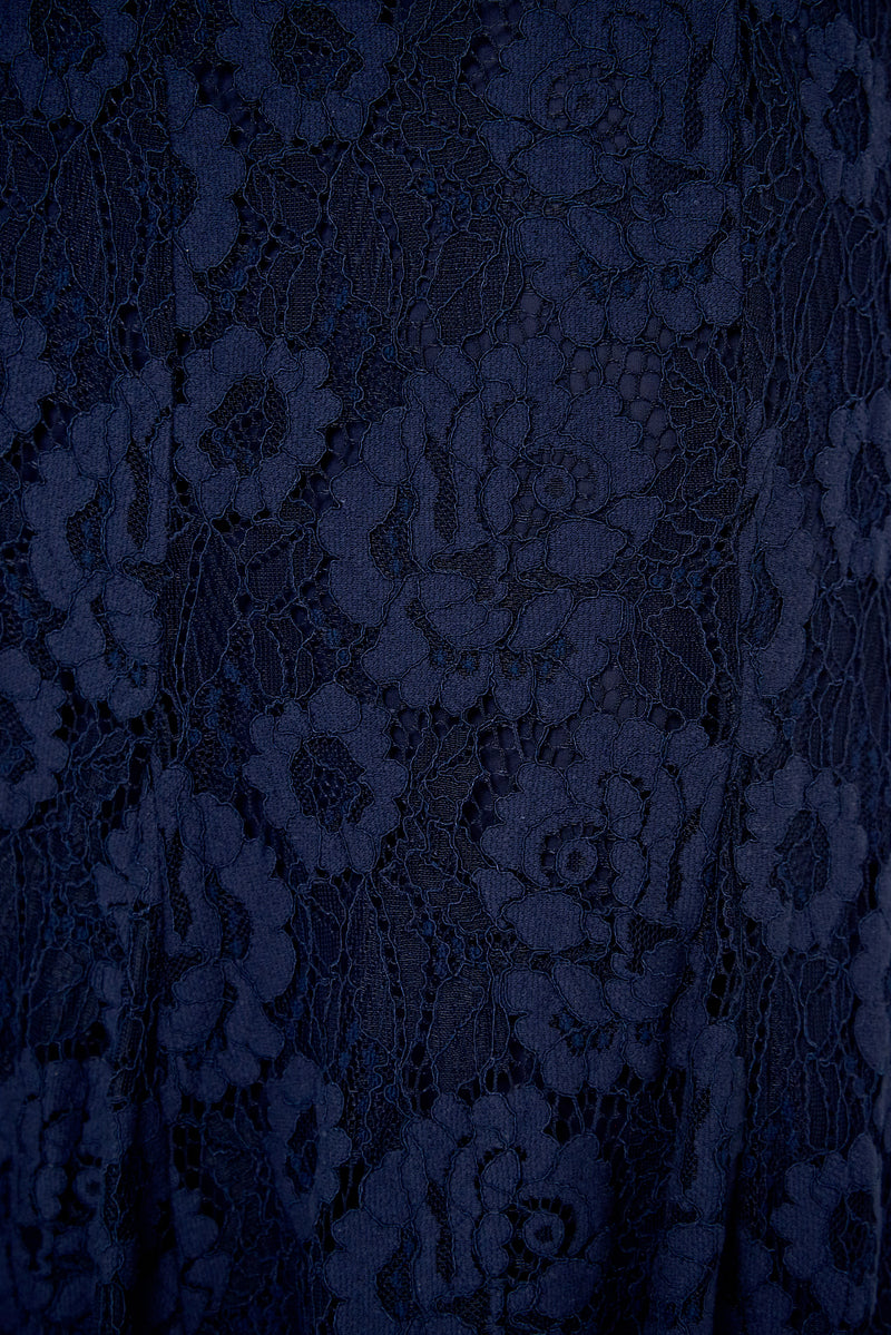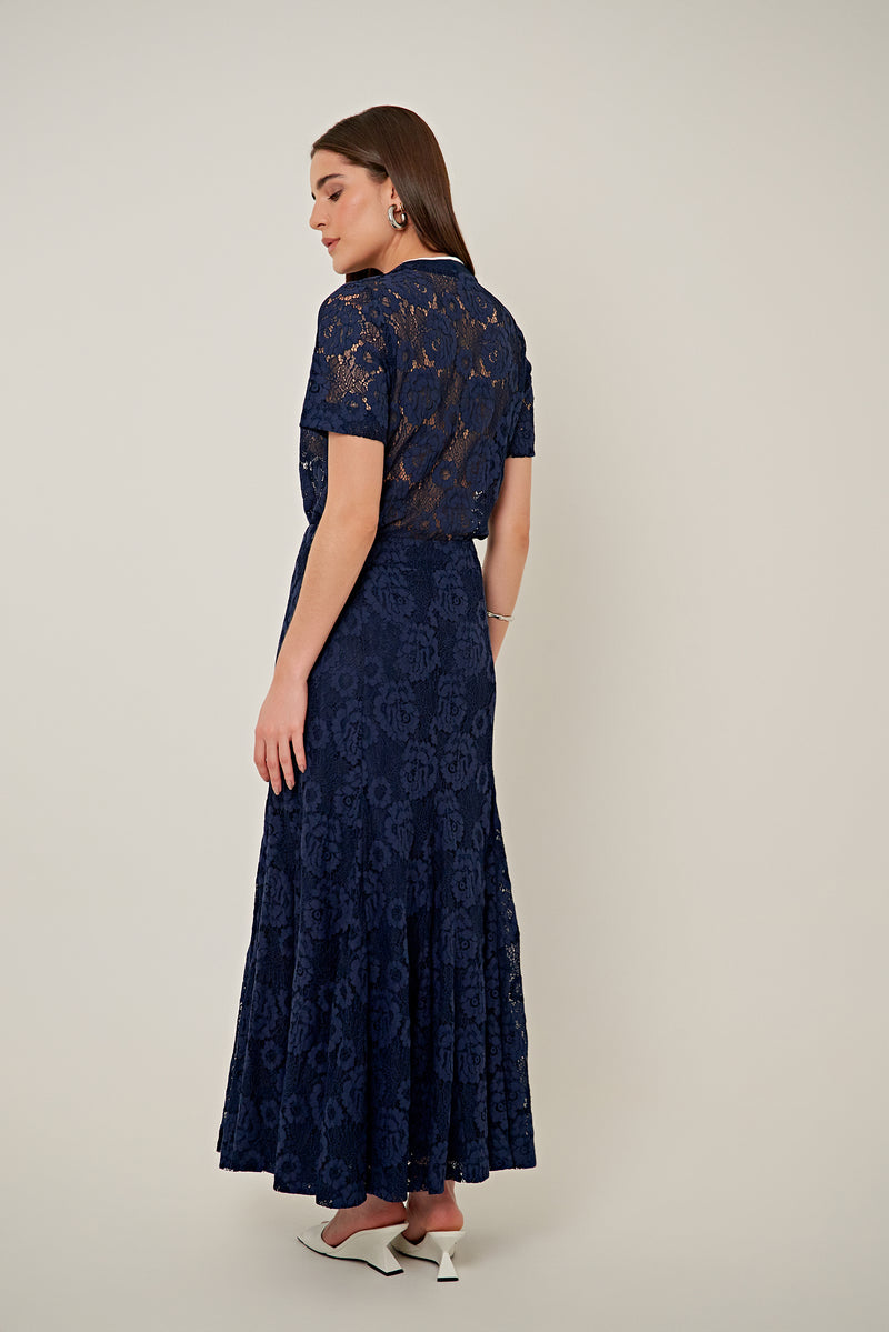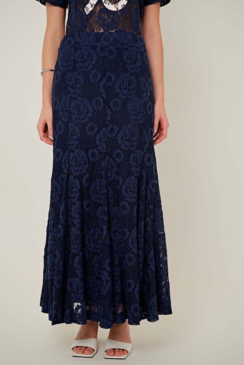 Saia Cleo confeccionada em renda de algodão azul marinho. Modelagem evasê, saia longa, cós aplicado com fechamento por zíper, forro leve e barra com acabamento simples. Coleção: Tokyo.
