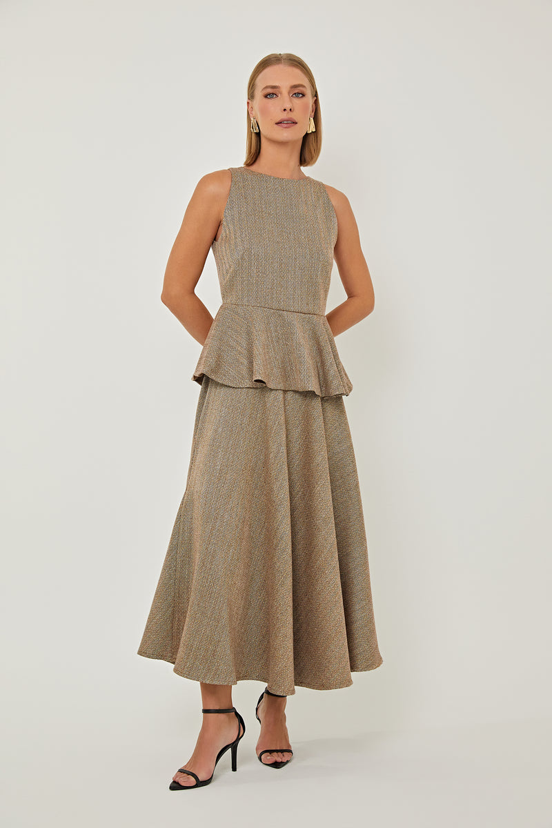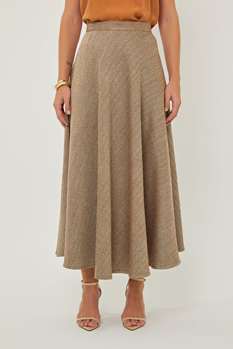 Saia Girassol confeccionada em alfaiataria com tweed chevron. Modelagem evasê, cos aplicado, comprimento longo e acabamento simples. Item versátil e atemporal, ideal para criar looks sofisticados. Coleção: Amour.
