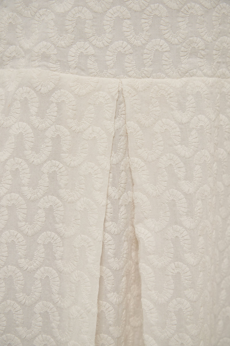 Saia Andressa Linda de Morrer confeccionada em laise de algodão off white. Possui caimento evasê, cos aplicado, comprimento longo e barra simples. Coleção: Verano.