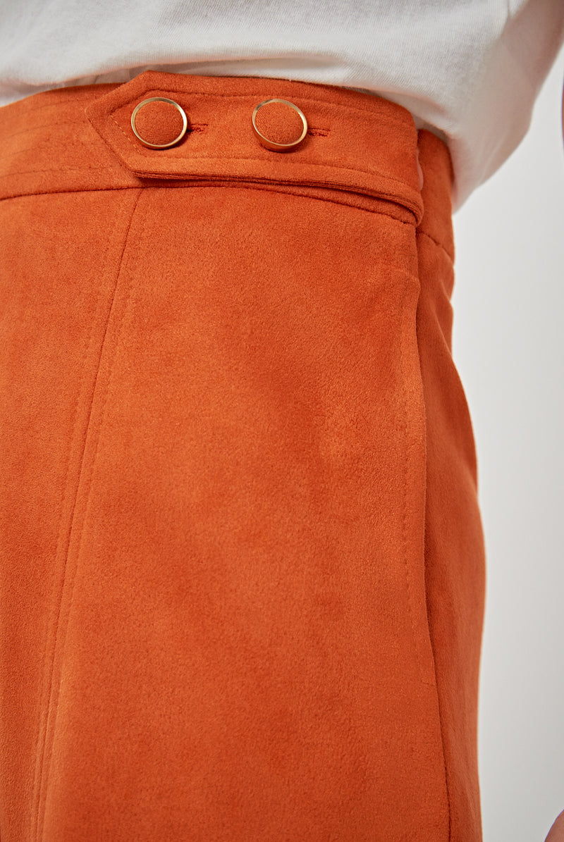 Saia Jurerê Linda de Morrer confeccionada em suede laranja. Possui caimento leve, cós aplicado com detalhe de botões e barra simples. Coleção: La Maison