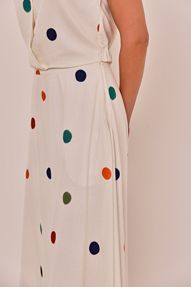 A saia Trendy é feita em viscolinho com estampa em poá multicolorida, disponível na cor off white. Possui modelagem evasê, cós aplicado, pregas laterais, bolsos laterais e barra simples. Estampa clássica em uma roupagem moderna e delicada.