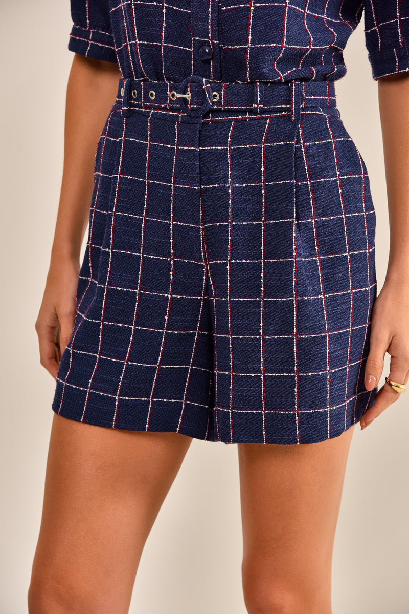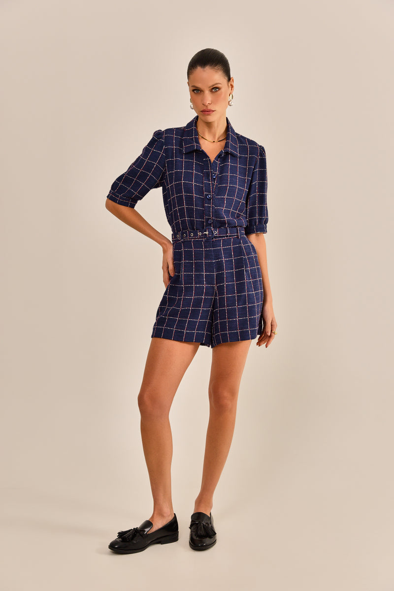 O shorts Alice é feito em tweed com padronagem xadrez, disponível na cor azul marinho. Possui modelagem reta, cós aplicado em cintura alta, bolsos laterais e acabamento simples. Shorts casual chic perfeito para compor um conjunto sofisticado. Acompanha cinto em mesmo tecido e cor agregando elegância ao look final.