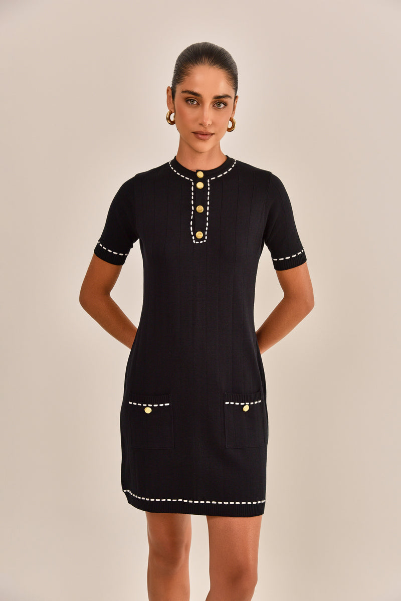 O vestido Analu é feito em tricot, disponível na cor preto. Com modelagem slim e comprimento curto, a peça une conforto e delicadeza. Possui decote redondo com gola polo, vista de botões, manga curta, bolsos frontais e acabamentos em pesponto em cor de contraste. Os botões dourados reforçam o estico clássico e elegante da peça.