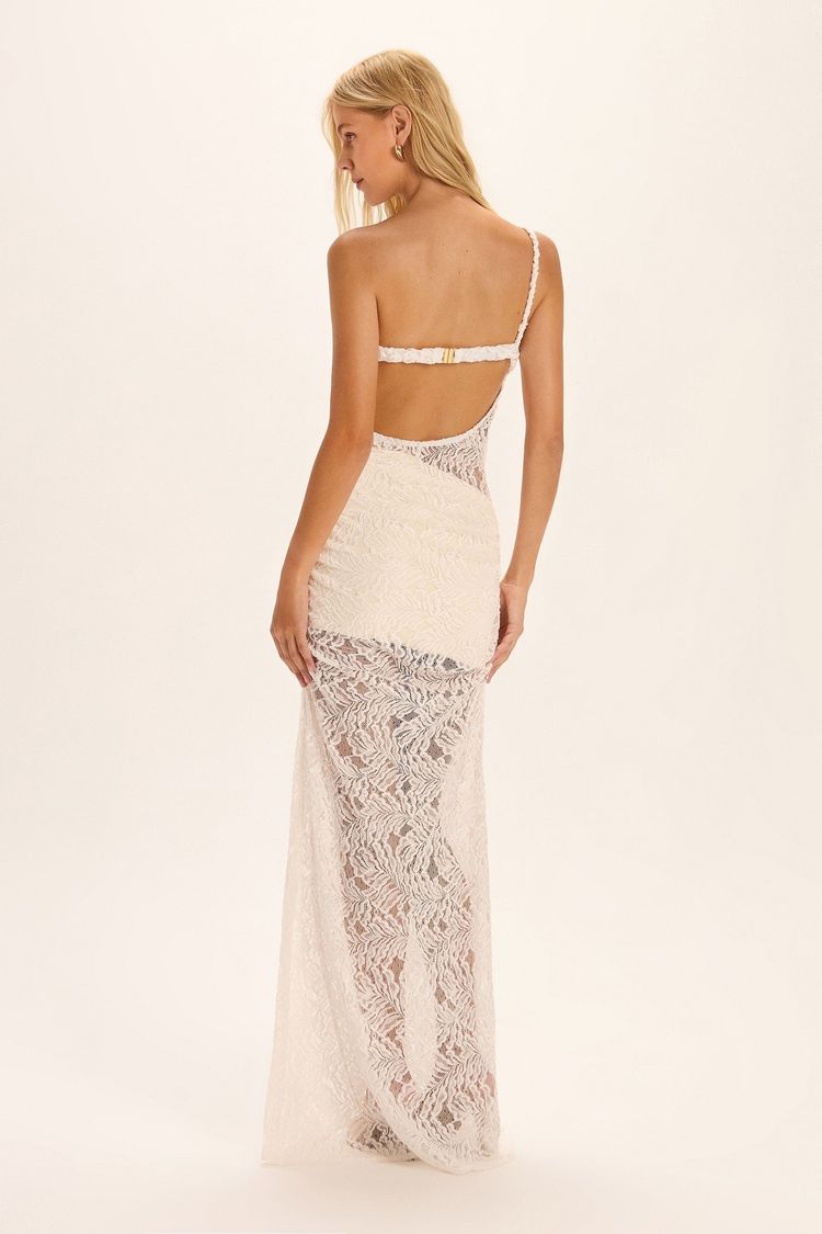 Vestido longo em renda com um ombro só e alça trançada, trazendo elegância e modernidade ao design. O forro assimétrico no tórax e na saia garante conforto e caimento perfeito. A saia leve em estilo sereia, juntamente com o fechamento traseiro por fivela metálica dourada, completa o visual sofisticado da peça.Renda e movimento em um ombro só.