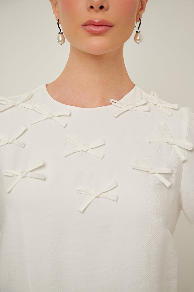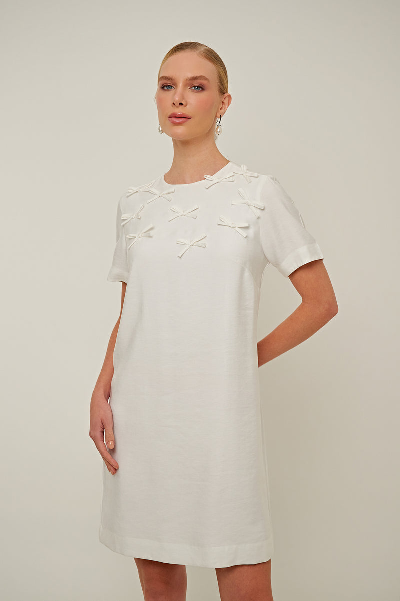 Vestido Débora confeccionada em alfaiataria de viscose off white com aplicação de laços no colo da peça. Modelagem reta, decote redondo, manga curta, comprimento curto e barra simples. Detalhe de fenda posterior com fechamento por botão. Coleção: Ateliê Dorama.
