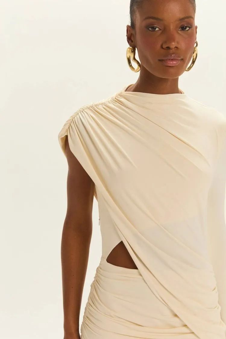O Vestido é confeccionado em jersey, possui modelagem justa, caimento acinturado, drapeados na lateral, mangas longas, cintura com recortes vazados, e acabamento premium.
