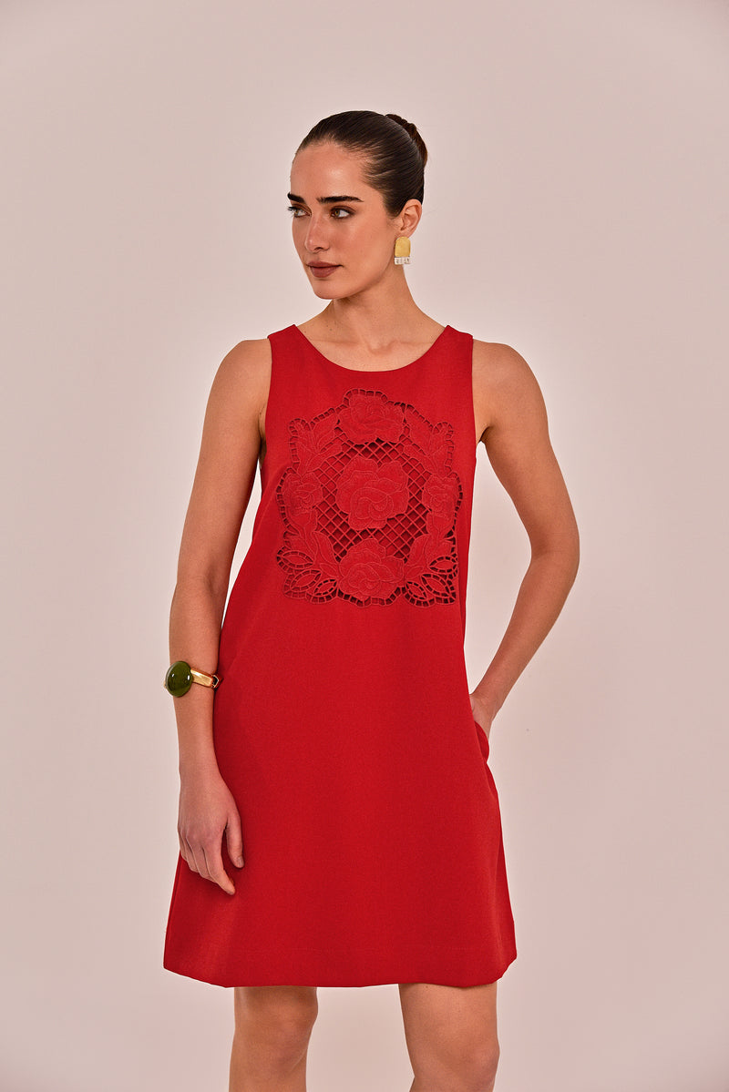 O vestido July é feito em alfaiataria, disponível na cor vermelho. Com modelagem reta e comprimento curto, a peça une conforto e leveza. Possui decote redondo, regata e acabamentos simples. Detalhe de bordado frontal de motivos florais no centro da peça.