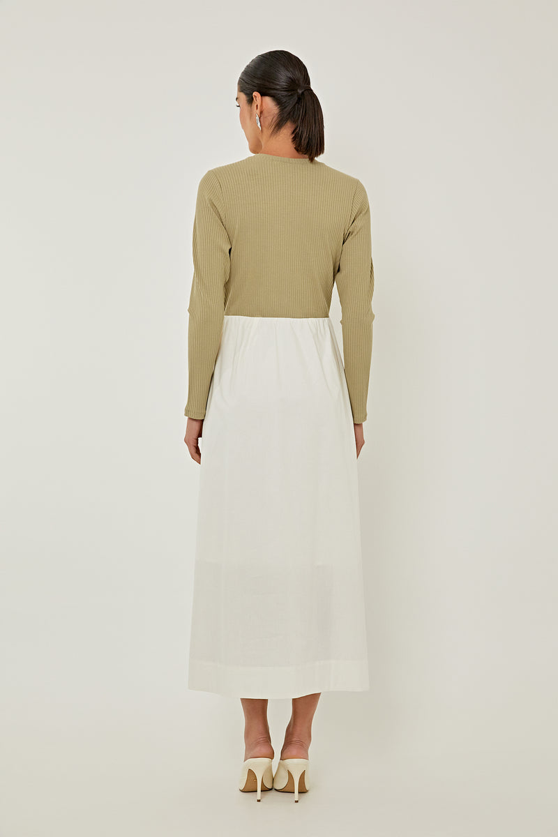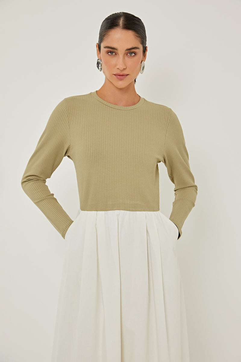 Vestido Heart confeccionado em malha canelada e tricoline, disponível em duas opções de cores, caqui com off white e preto com off white. Modelagem slim, decote redondo, manga longa, saia tricoline com modelagem evazê, bolsos laterais e barra simples. Coleção: Ser Linda.