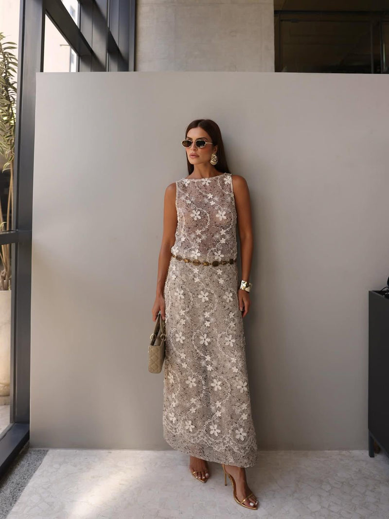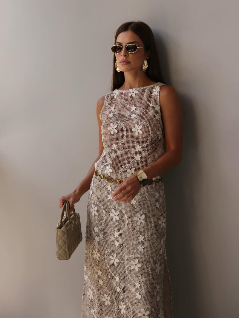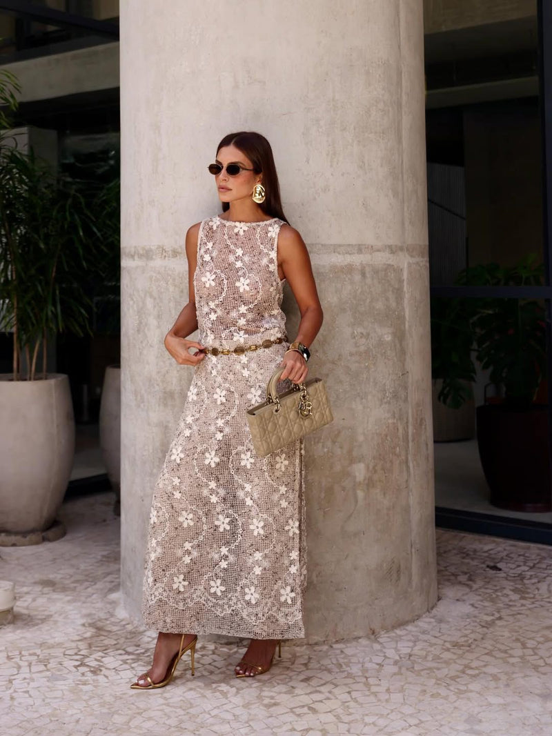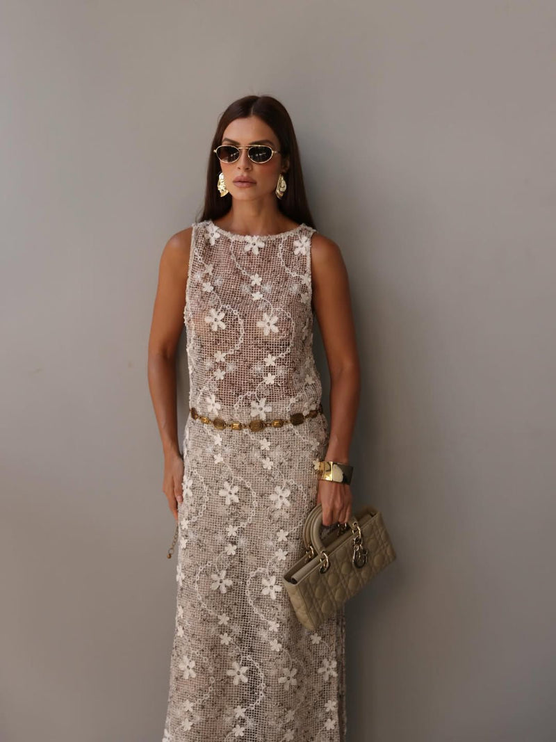 O vestido Ondas é confeccionado em tela com bordado floral aplicado, disponível na cor ercu. Modelagem slim, caimento leve, decote redondo, regata, comprimento longo com fendas laterais e acabamento simples. Acompanha vestido forro avulso em viscose no mesmo tom.