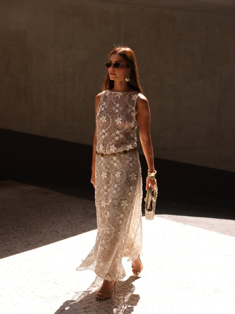O vestido Ondas é uma peça rica em texturas e detalhes que agregam elegância ao seu look final. Parte da coleção Santorini, inspirada na harmonia entre céu e mar, na luz radiante e na sofisticação natural do Mediterrâneo.