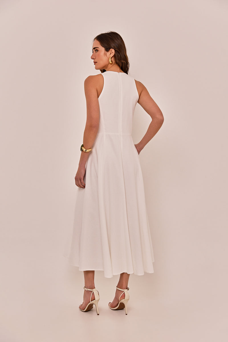 O vestido Paradise é feito em tricoline, disponível na cor off white. Com modelagem evasê e comprimento longo, a peça une leveza e elegância. Possui decote redondo, regata, barra com acabamento simples. O detalhe fica por conta dos bordados florais em richelieu aplicados em pontos estratégicos da peça.