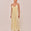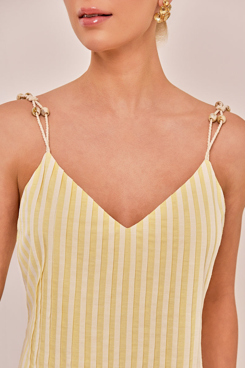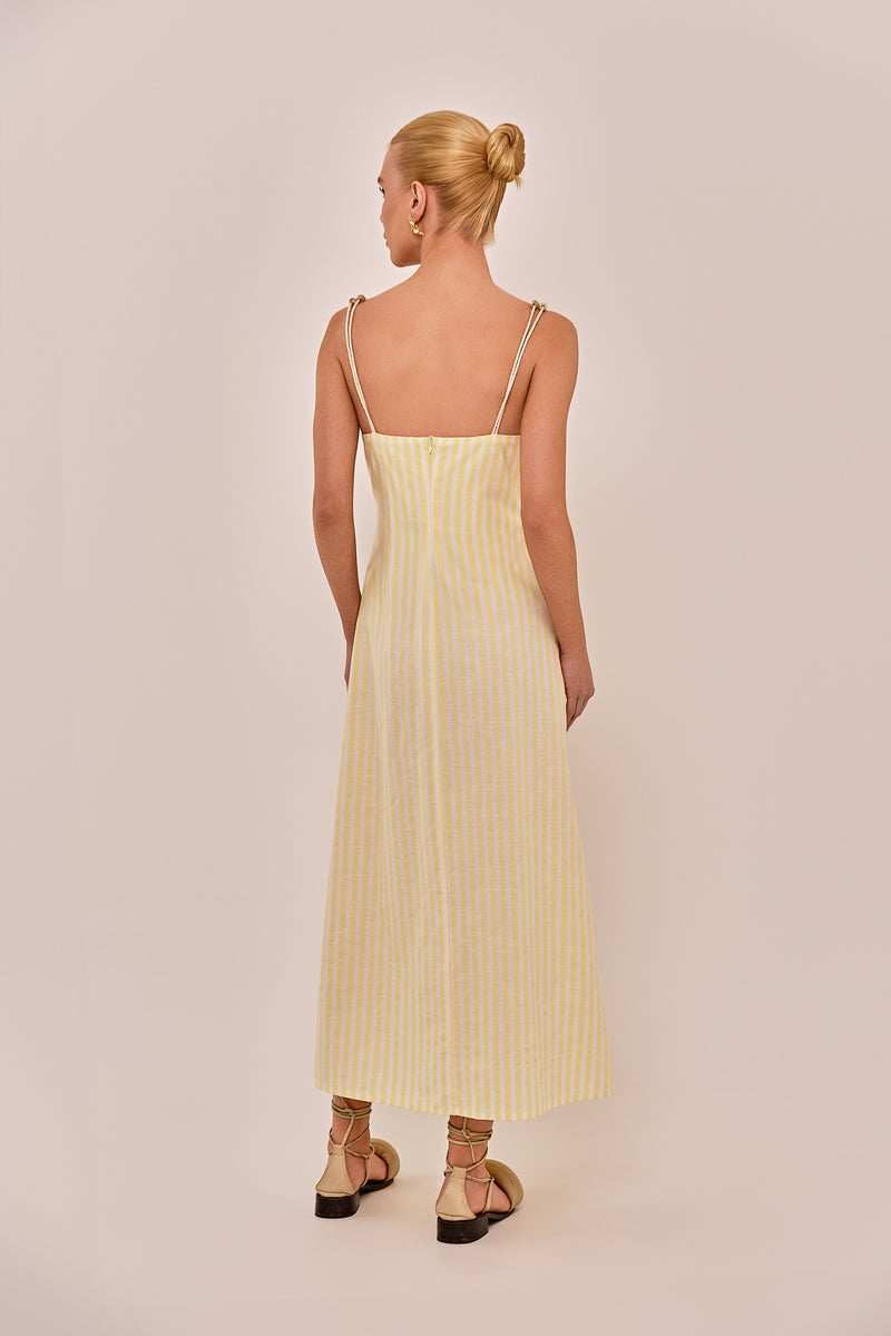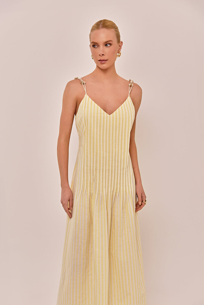 Vestido Peônia confeccionado em algodão listrado na cor amarelo. Modelagem evasê, alças finas e acabamentos simples. Detalhe frontal com drapeados manuais. Peça delicada, leve e romântica.