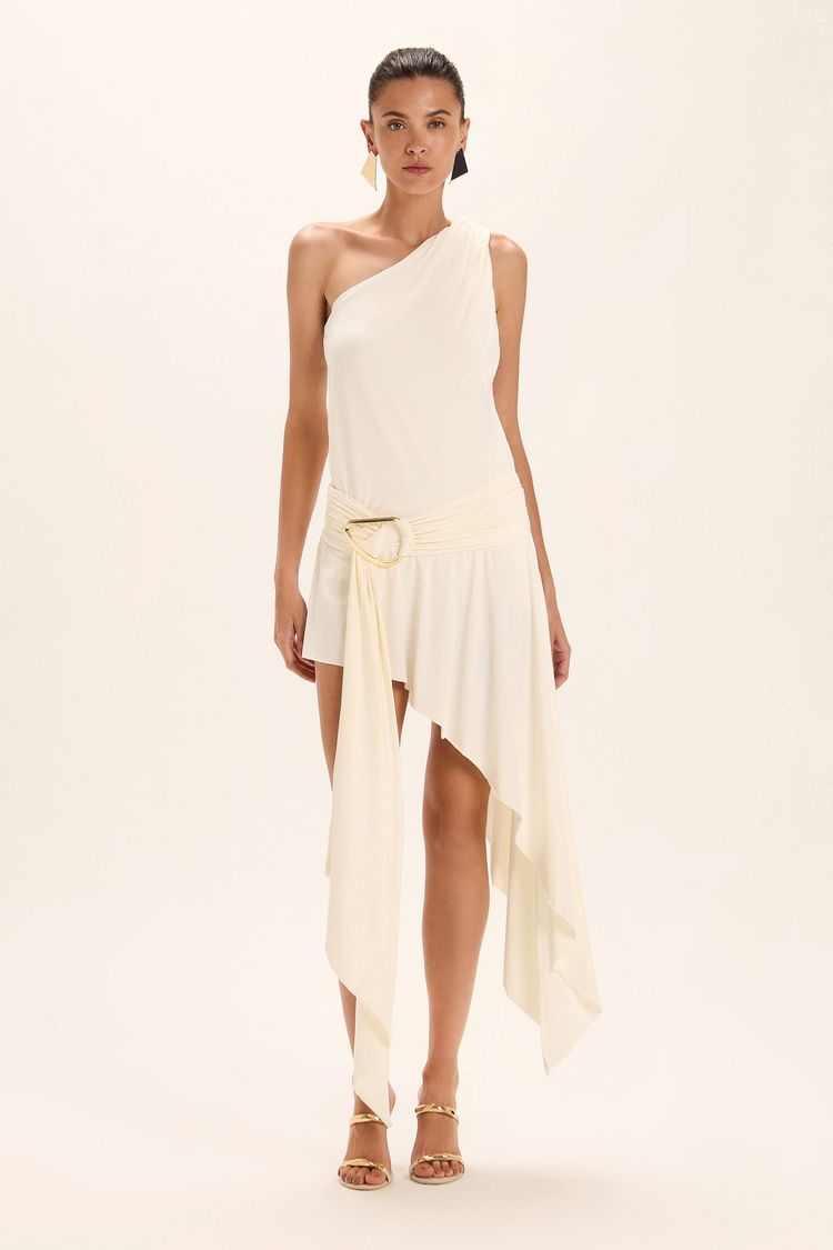 Vestido em malha poliamida com modelagem ombro só e cava levemente aprofundada na lateral, criando um caimento elegante e moderno. A saia conta com shortinho embutido estilo body para conforto e segurança.Sofisticação assimétrica com detalhes funcionais.